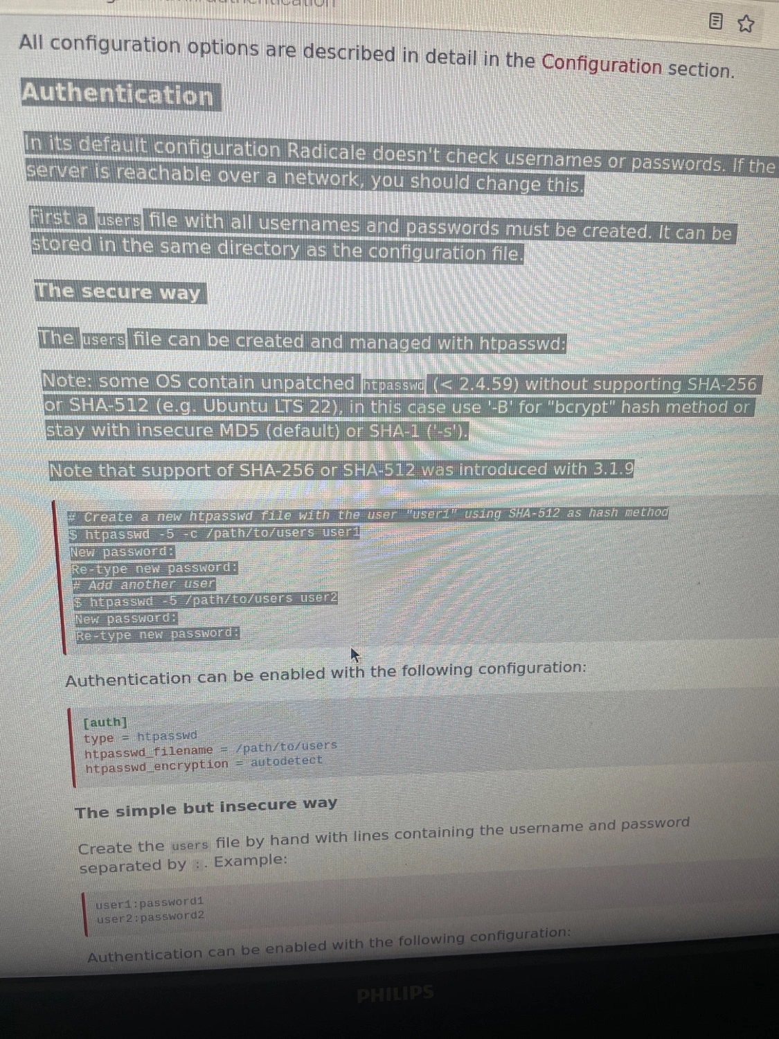 But I think I’m understanding a bit! I need to literally create a file named “/etc/radicale/config”. Then after that I need to copy/paste the configuration file/command line into said folder. Once I do that then I should be able to move onto authentication and then addresses.