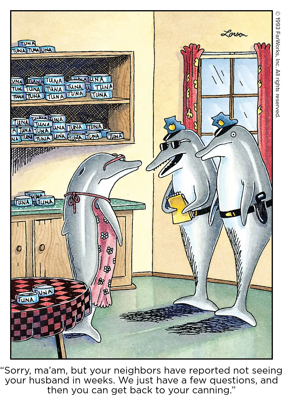 “Sorry, ma’am, but your neighbors have reported not seeing your husband in weeks. We just have a few questions, and then you can get back to your canning.”