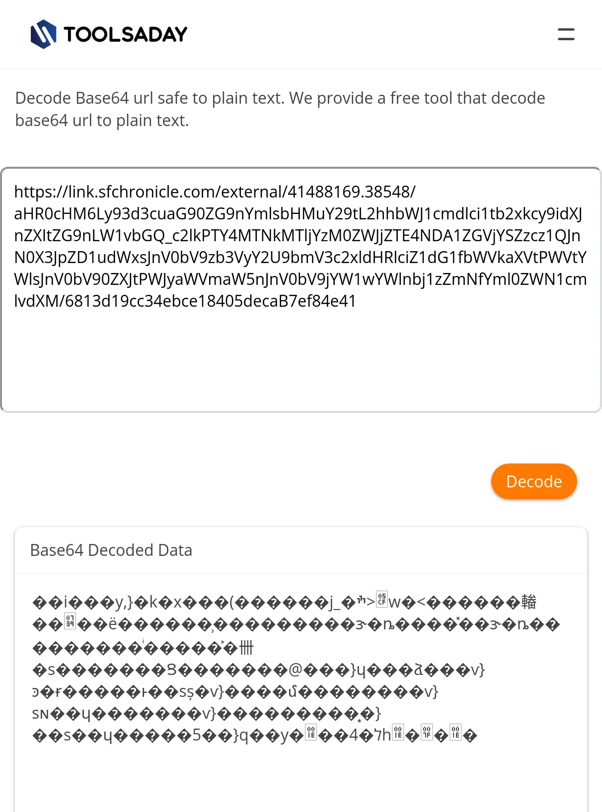 character isn’t a part of the base64 encoding. In fact, only one part of the URL looks like base64. No plain base64 tool (whether via CLI, self-hosted, or otherwise) will be able to decode an entire URL like that. You’ll first need to parse the URL to isolate the base64 part. This is literally solved with a single line of bash:echo "https://link.sfchronicle.com/external/41488169.38548/aHR0cHM6Ly93d3cuaG90ZG9nYmlsbHMuY29tL2hhbWJ1cmdlci1tb2xkcy9idXJnZXItZG9nLW1vbGQ_c2lkPTY4MTNkMTljYzM0ZWJjZTE4NDA1ZGVjYSZzcz1QJnN0X3JpZD1udWxsJnV0bV9zb3VyY2U9bmV3c2xldHRlciZ1dG1fbWVkaXVtPWVtYWlsJnV0bV90ZXJtPWJyaWVmaW5nJnV0bV9jYW1wYWlnbj1zZmNfYml0ZWN1cmlvdXM/6813d19cc34ebce18405decaB7ef84e41" | cut -d/ -f6 | base64 -d