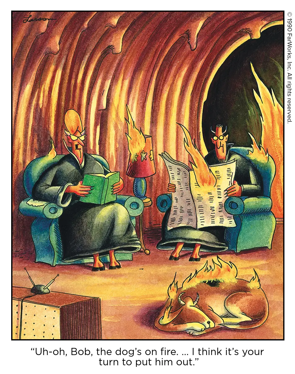 “Uh-oh, Bob, the dog’s on fire. … I think it’s your turn to put him out.”
