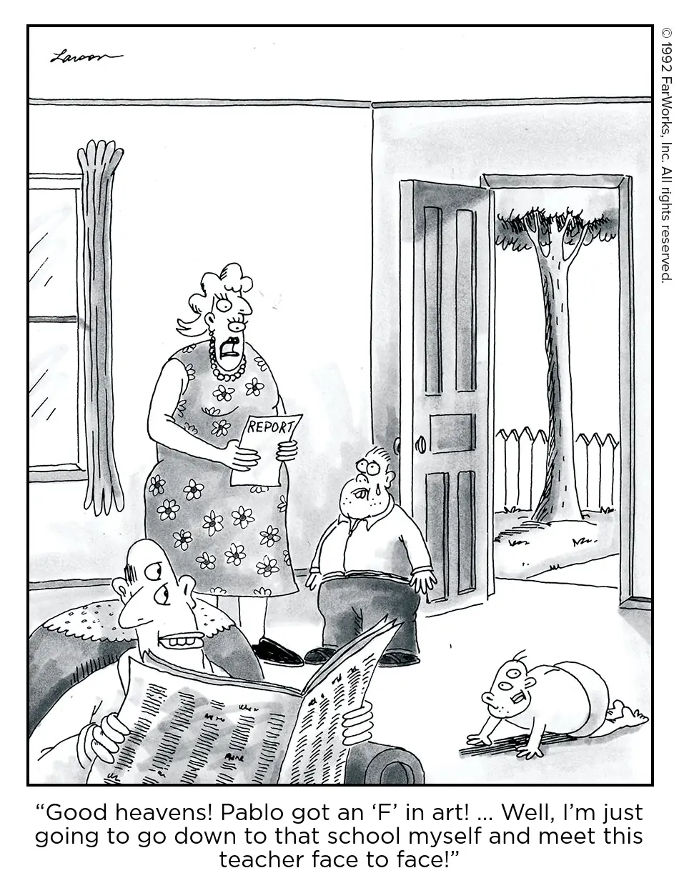 “Good heavens! Pablo got an ‘F’ in art! … Well, I’m just going to go down to that school myself and meet this teacher face to face!”