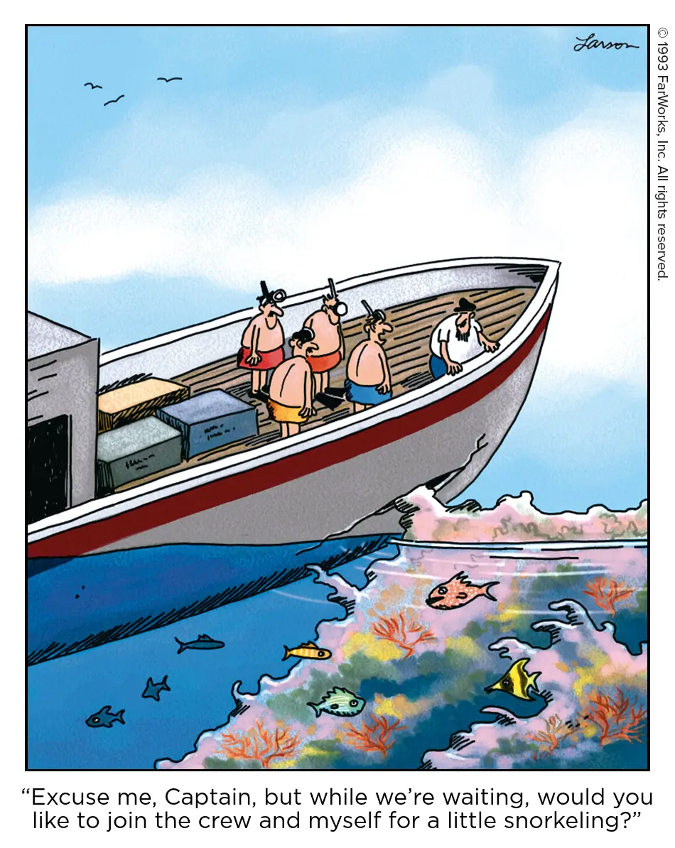 “Excuse me, Captain, but while we’re waiting, would you like to join the crew and myself for a little snorkeling?”