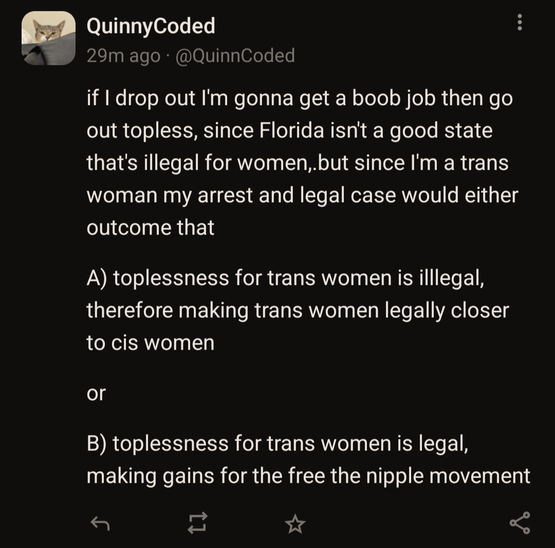 TLDR If I get arrested for being topless as a trans women the outcome would either be