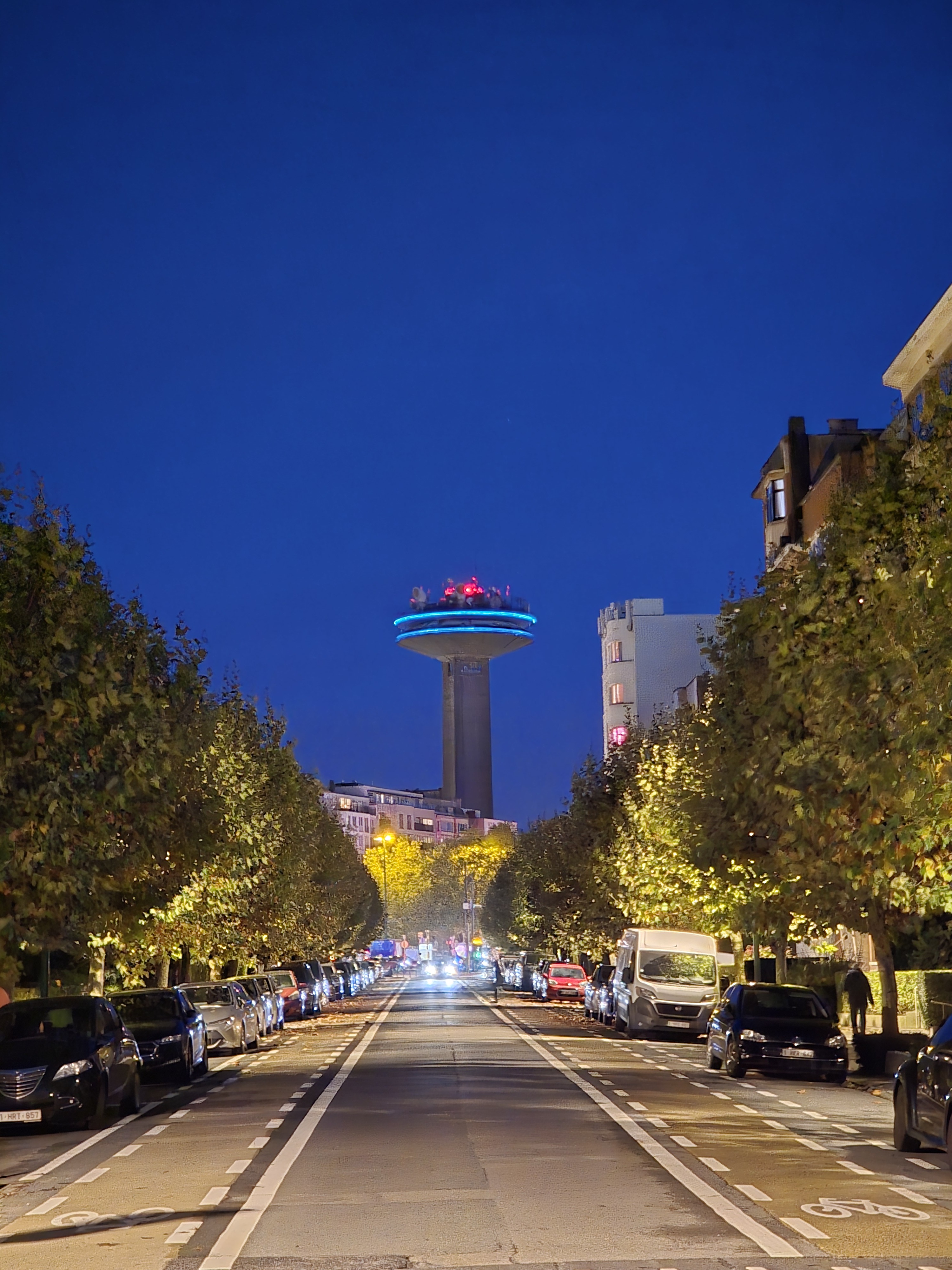 Pretty sure thats an air traffic control tower, i.e. a watchtower with people in it. The “saucer” shape is so they can see in every direction