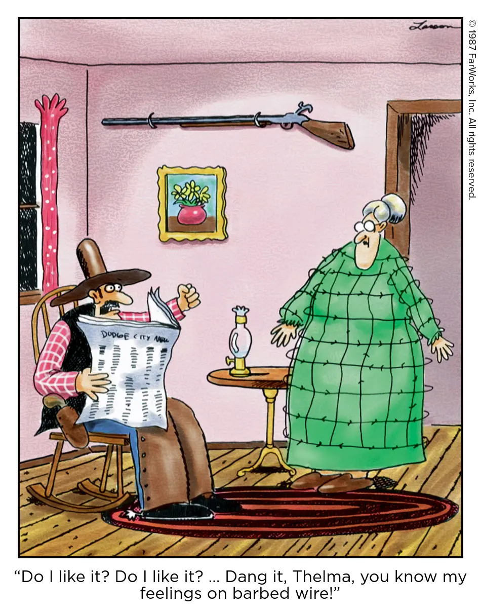 “Do I like it? Do I like it? … Dang it, Thelma, you know my feelings on barbed wire!”