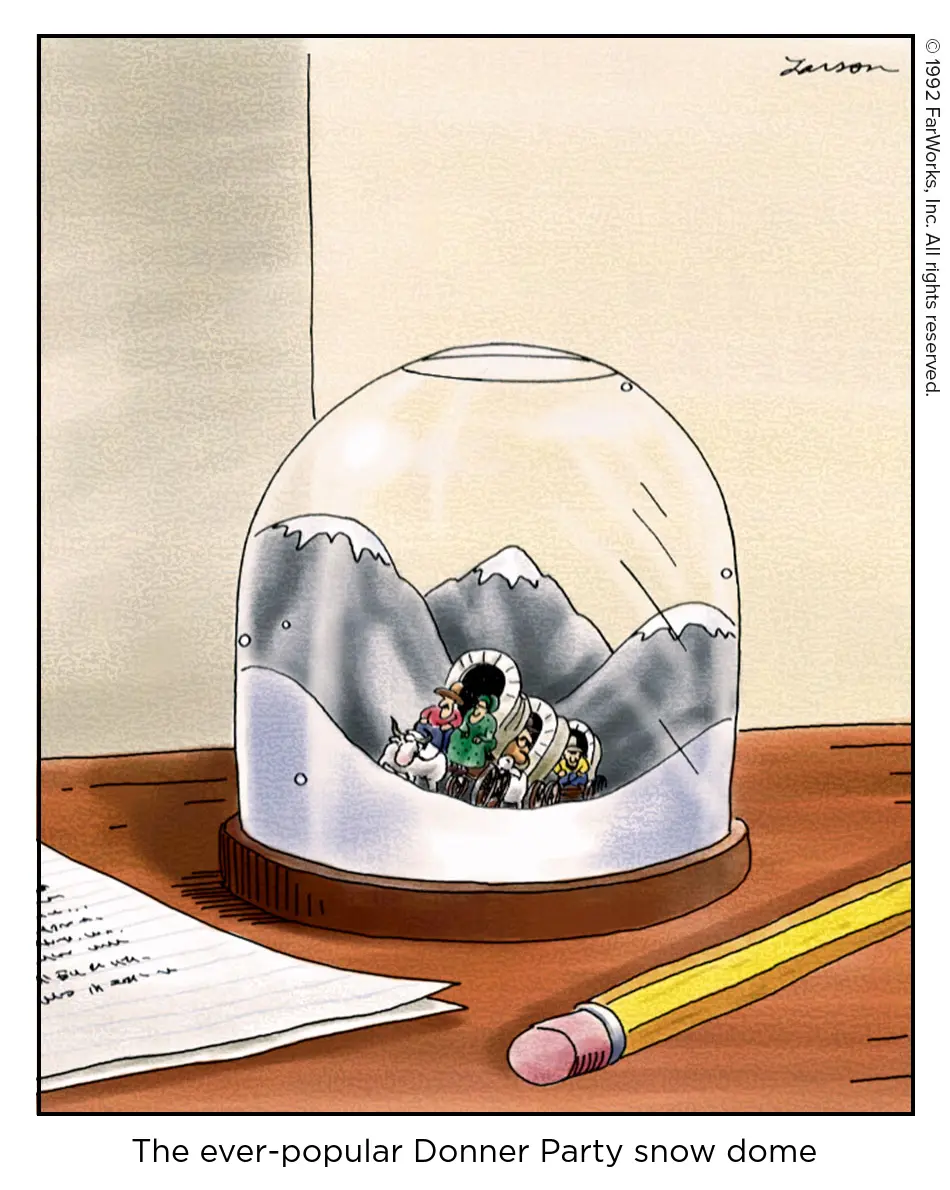 Interestingly it wasn’t the Donner party’s fault but a bastard who published trail info without ever having done that trail himself.