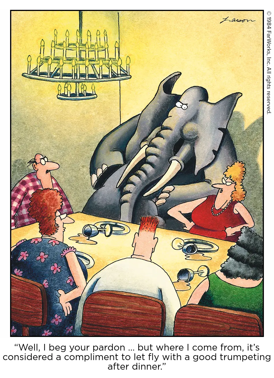 “Well, I beg your pardon … but where I come from, it’s considered a compliment to let fly with a good trumpeting after dinner.”