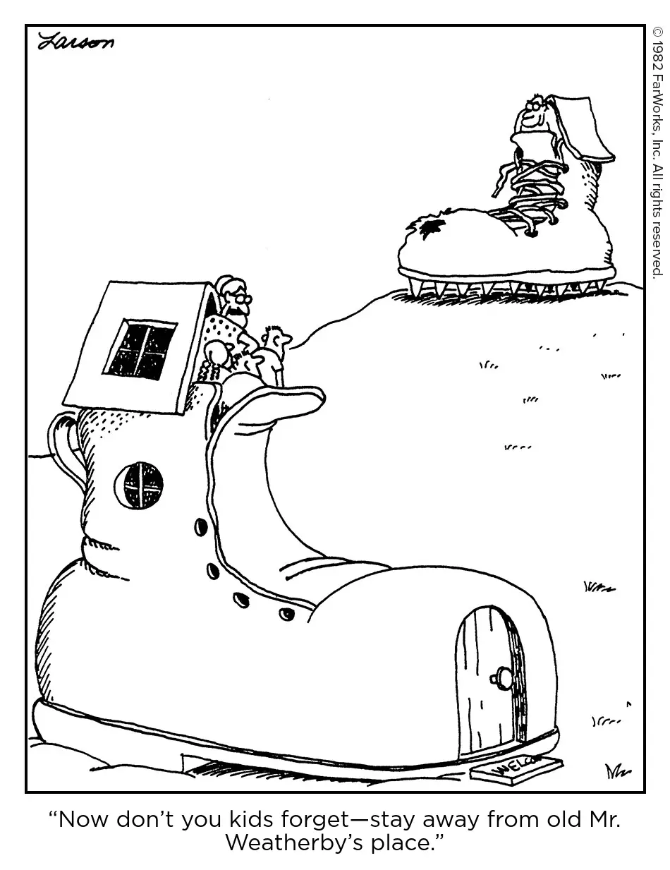 I think the joke here is just that she’s warning her kids to stay away from the weird old man’s house, which is kind of a trope on its own, and then merged with the nursery rhyme. The house she’s warning the kids to stay away from is a squalid, rundown house as you might expect, but it’s funny (presumably, ymmv) to think about what that would look like as a shoe.