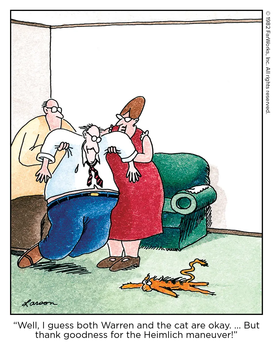 Today the Red Cross recommends 5 back slaps and then the Heimlich maneuver (which they’ve renamed “abdominal thrusting”).