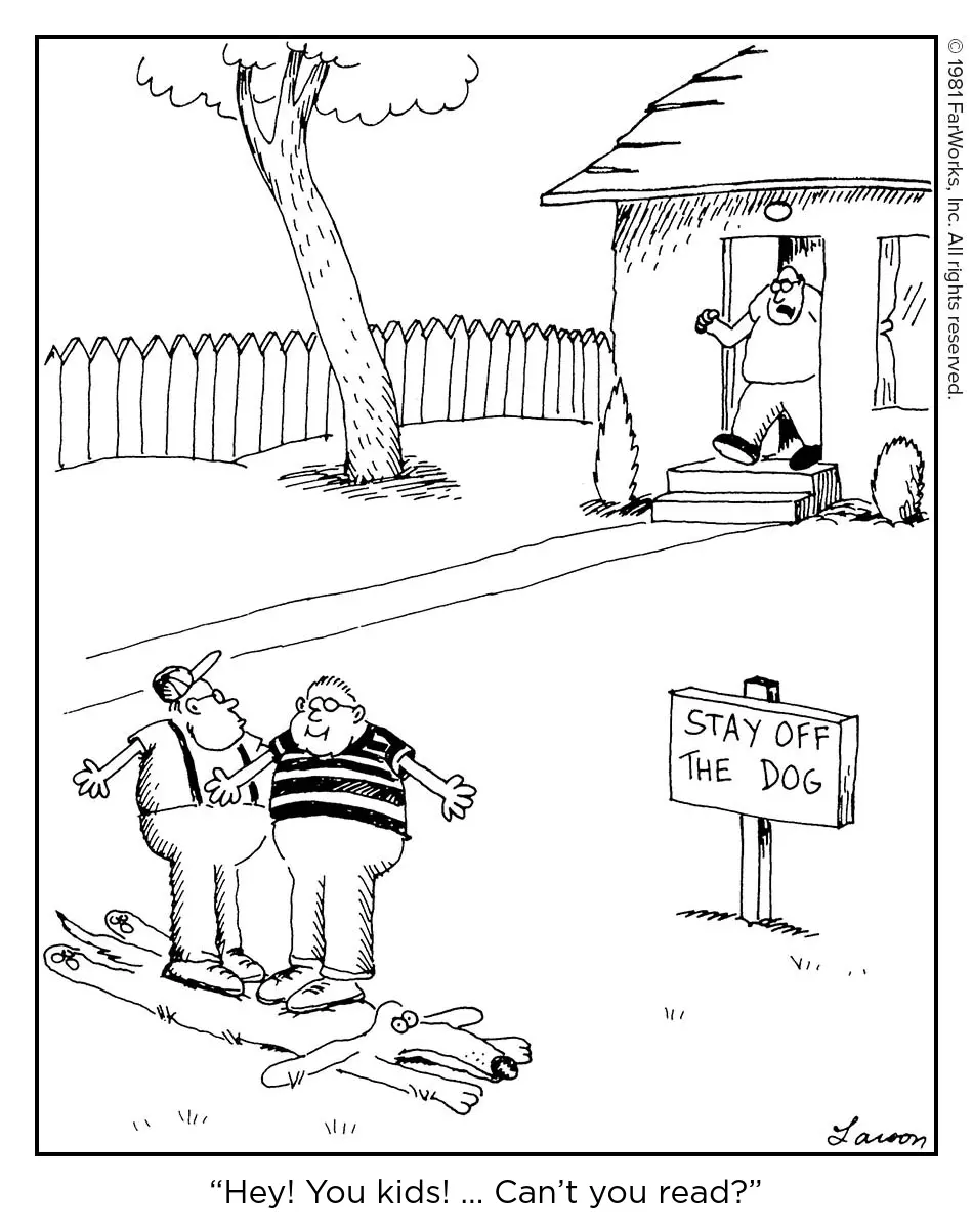 The submitted version of this cartoon is seen here on the left. My editor, however, believed something more was needed to clarify why this guy coming out of the house is so mad―so he changed the caption to the version on the right. I acquiesced on this one, but always felt like it was redundant and too leading. I later restored my preferred version for inclusion in a book.