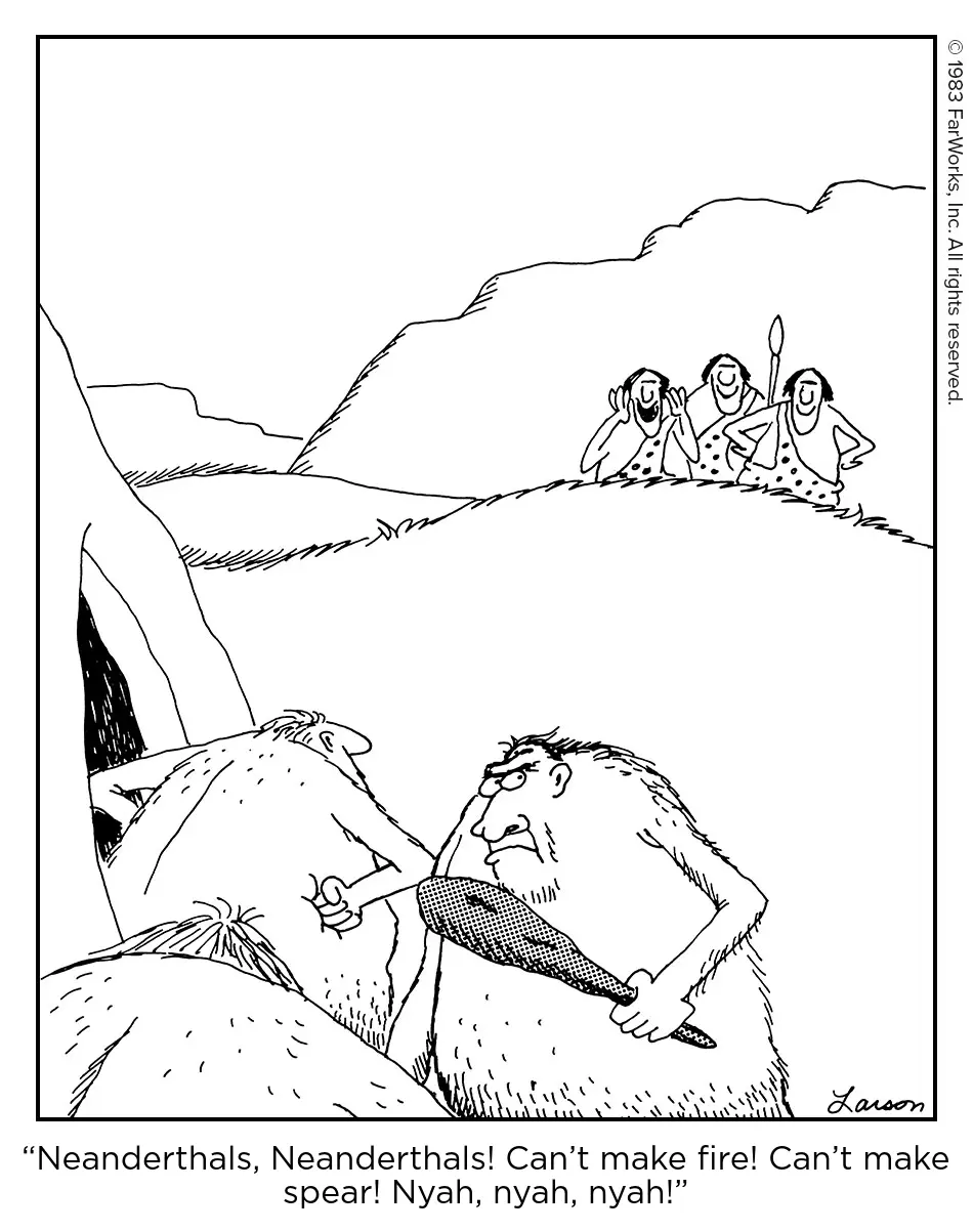 “Neanderthals, Neanderthals! Can’t make fire! Can’t make spear! Nyah, nyah, nyah!”