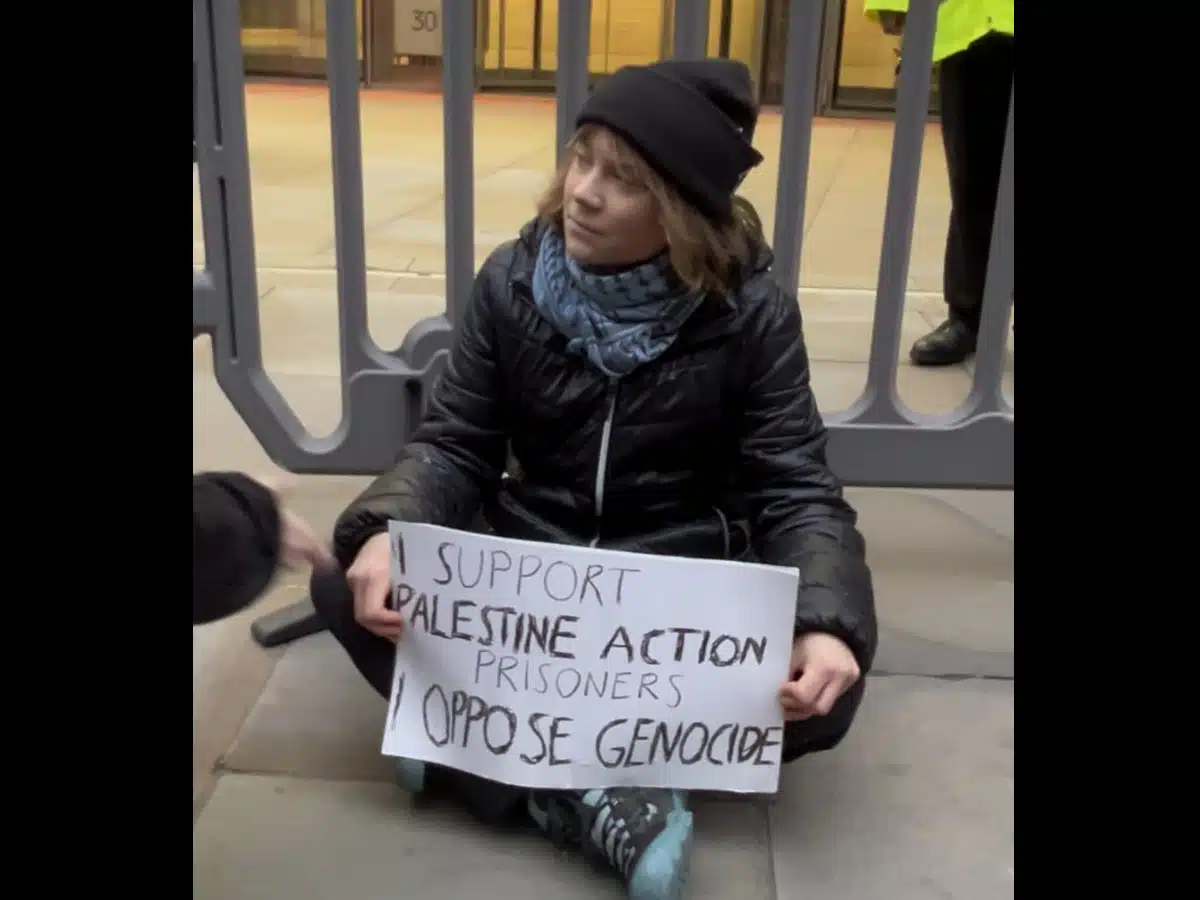 After the two activists locked-on at the front of the Aspen offices, they were joined by supporters. Swedish activist Greta Thunberg then arrived, holding a banner reading, “I support the Palestine Action prisoners. I oppose genocide.” She was then arrested by police. This follows an arrest in Scotland, where a protestor was arrested under Section 13 of the Terrorism Act, for holding a sign reading, “I support the Palestine Action hunger strikers.”