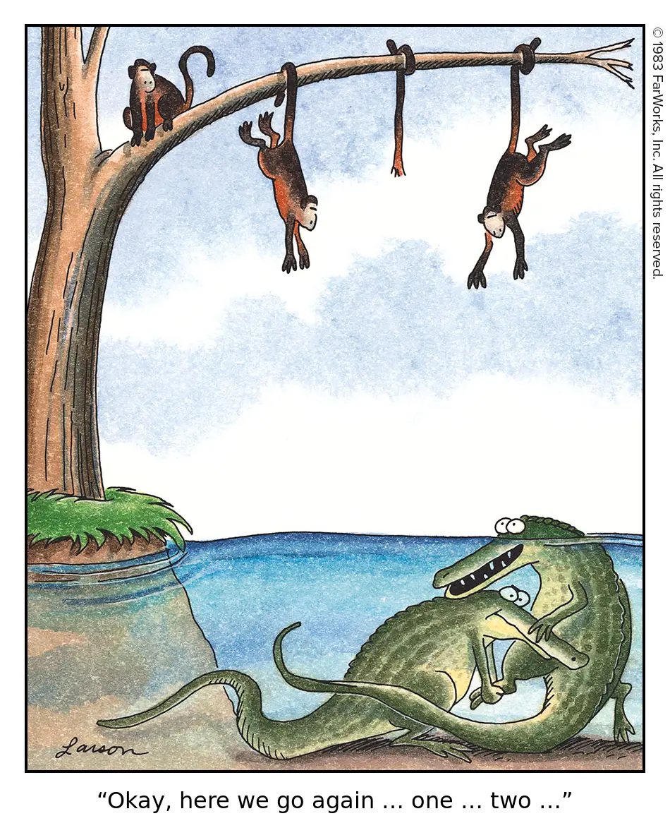 The Los Angeles Times, which carries The Far Side, has taken umbrage with my cartoon on several occasions. (Apparently, someone there actually reads the comics beforehand.) These three, as I recall, created some conflicts with the “good taste” standards of that paper, and I believe all three were deleted from their comic page back in the early eighties.