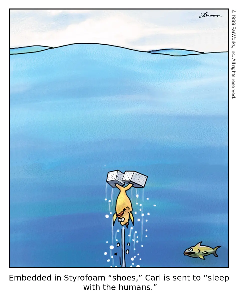 Embedded in Styrofoam “shoes,” Carl is sent to “sleep with the humans.”