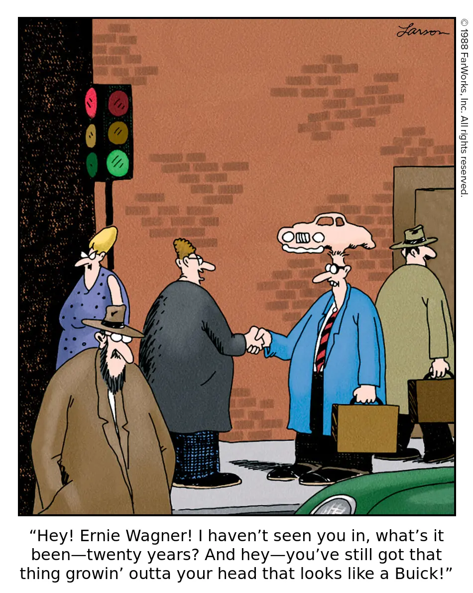 “Hey! Ernie Wagner! I haven’t seen you in, what’s it been—twenty years? And hey—you’ve still got that thing growin’ outta your head that looks like a Buick!”
