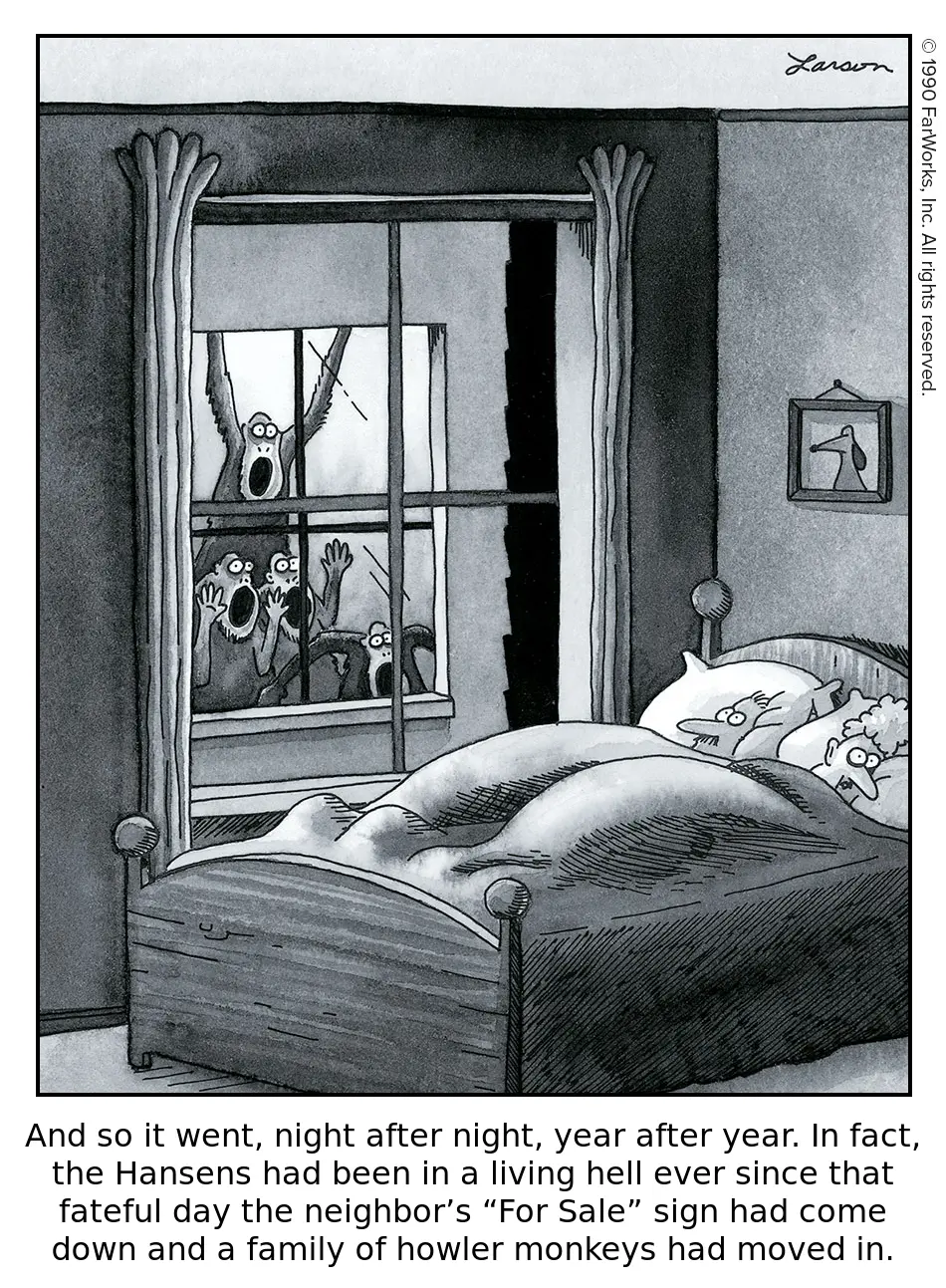 And so it went, night after night, year after year. In fact, the Hansens had been in a living hell ever since that fateful day the neighbor’s “For Sale” sign had come down and a family of howler monkeys had moved in.