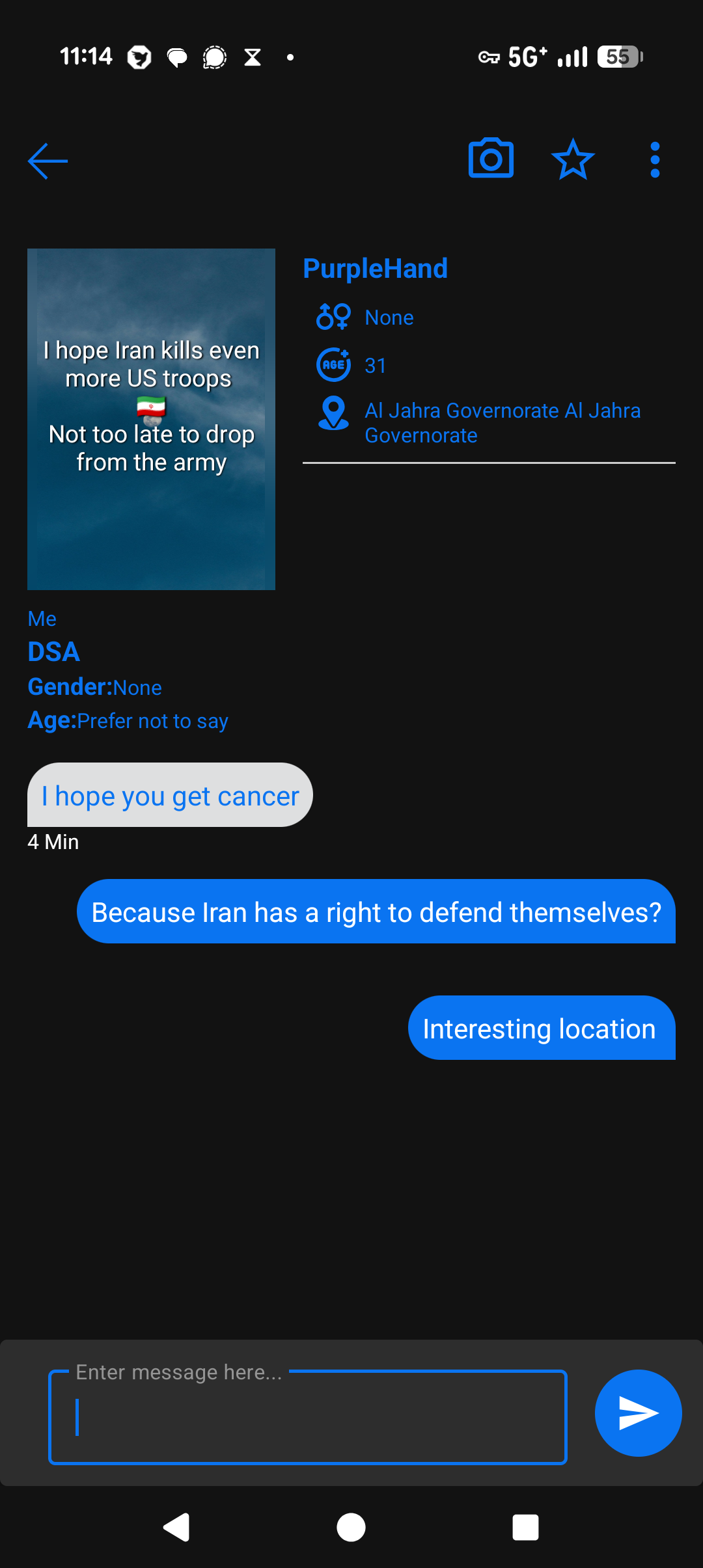 Can’t tell if this is a op sec failure or psy op, but I’m pretty sure I got a us soldier to reveal their location in al jahrah governate.
