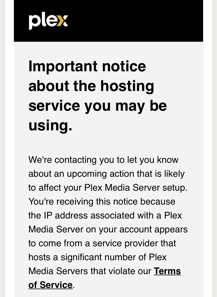 Briongloid@aussie.zone to Selfhosted@lemmy.worldEnglish · edit-23 years agoPlex will be blocking access from at least one VPS providerplus-squareimgur.comexternal-linkmessage-square1fedilinkarrow-up11