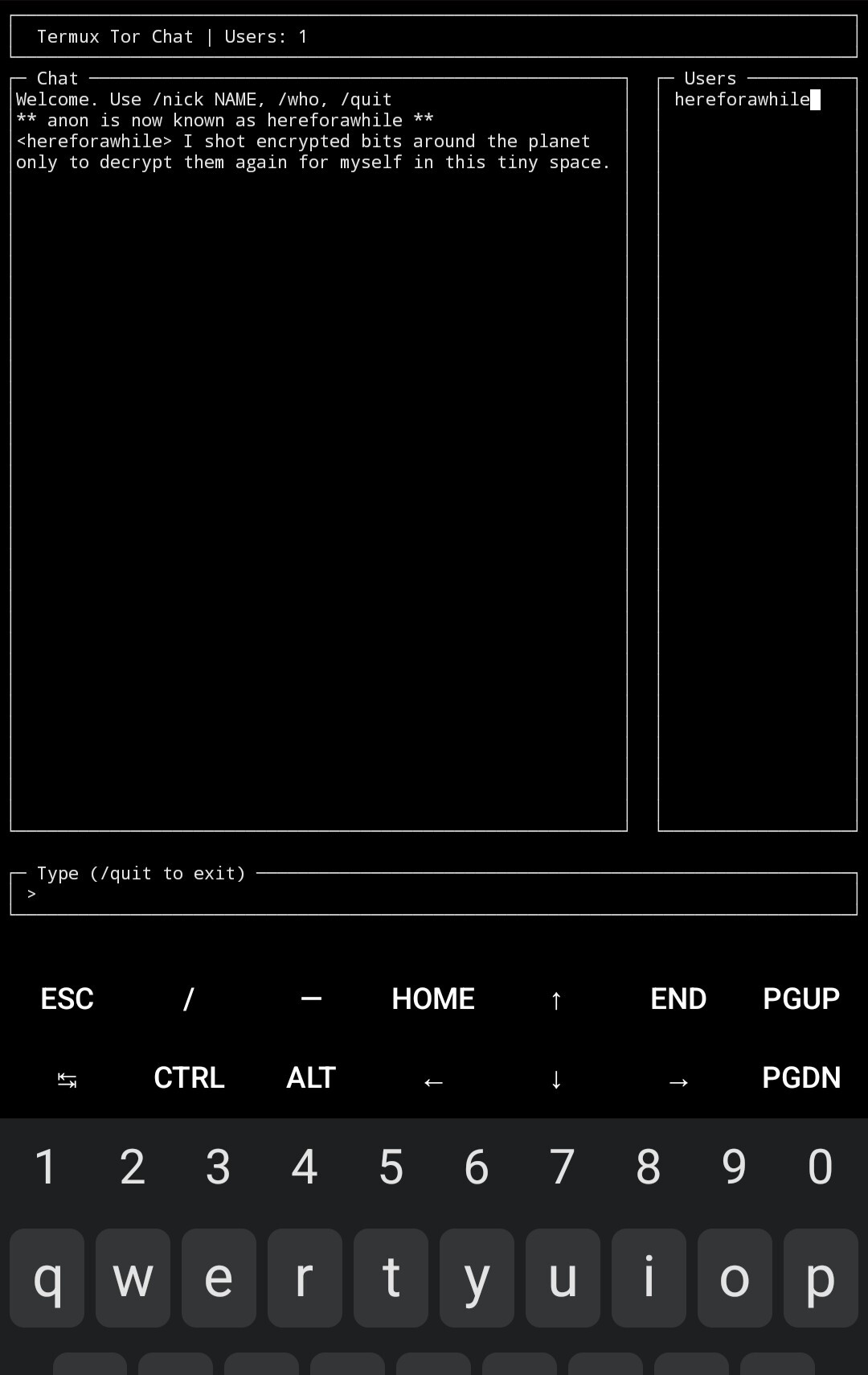 -Ability to turn on persistent rooms. By default, the server only relays in real time. /persist turns on chat logs. The server then stores encrypted messages and users can chat asynchronously.